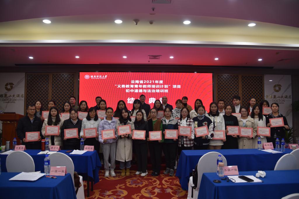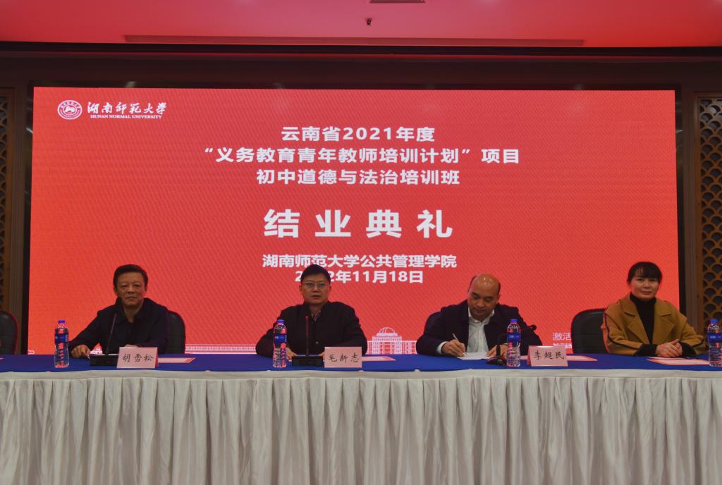 11月18日上午11点30分,由我院承办的云南省2021年度“义务教育青年教师计划”项目初中道德与法治培训班结业典礼在通程麓山大酒店三号楼二楼湘汇厅圆满举行。我院院长毛新志,副院长胡雪松、李超民、培训中心主任王群出席了典礼。典礼由班主任邹水平主持。