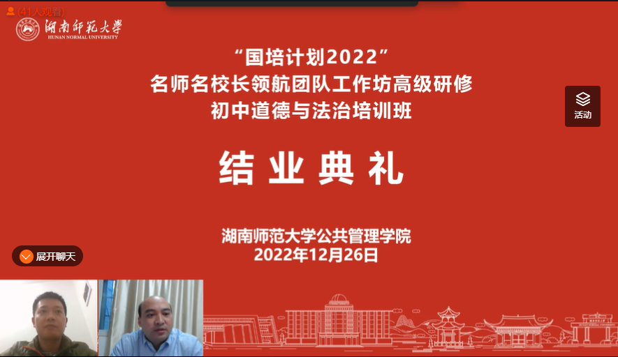 12月26日下午16:30,由我院承办的“国培计划2022”—名师名校长领航团队工作坊高级研修·初中道德与法治培训班(C215)线上结业典礼在奥鹏师训宝平台顺利举行。我院副院长李超民、培训中心主任王群和班主任邹水平出席了典礼。典礼由邹水平老师主持。