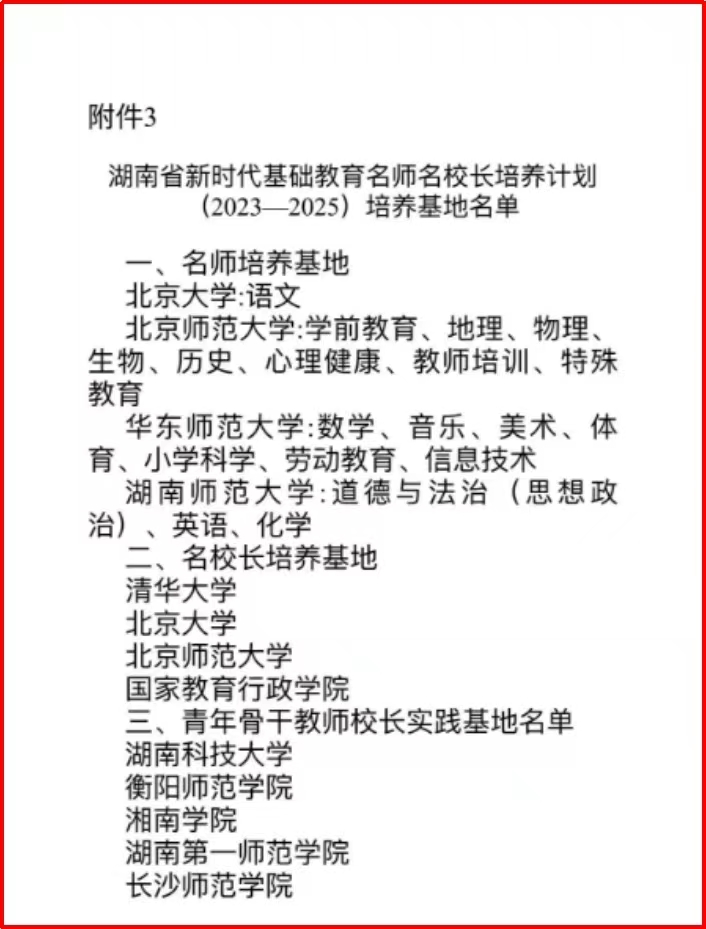 相关链接:关于公布湖南省新时代基础教育名师名校长培养计划(2023—2025)培养对象及培养基地名单的通知